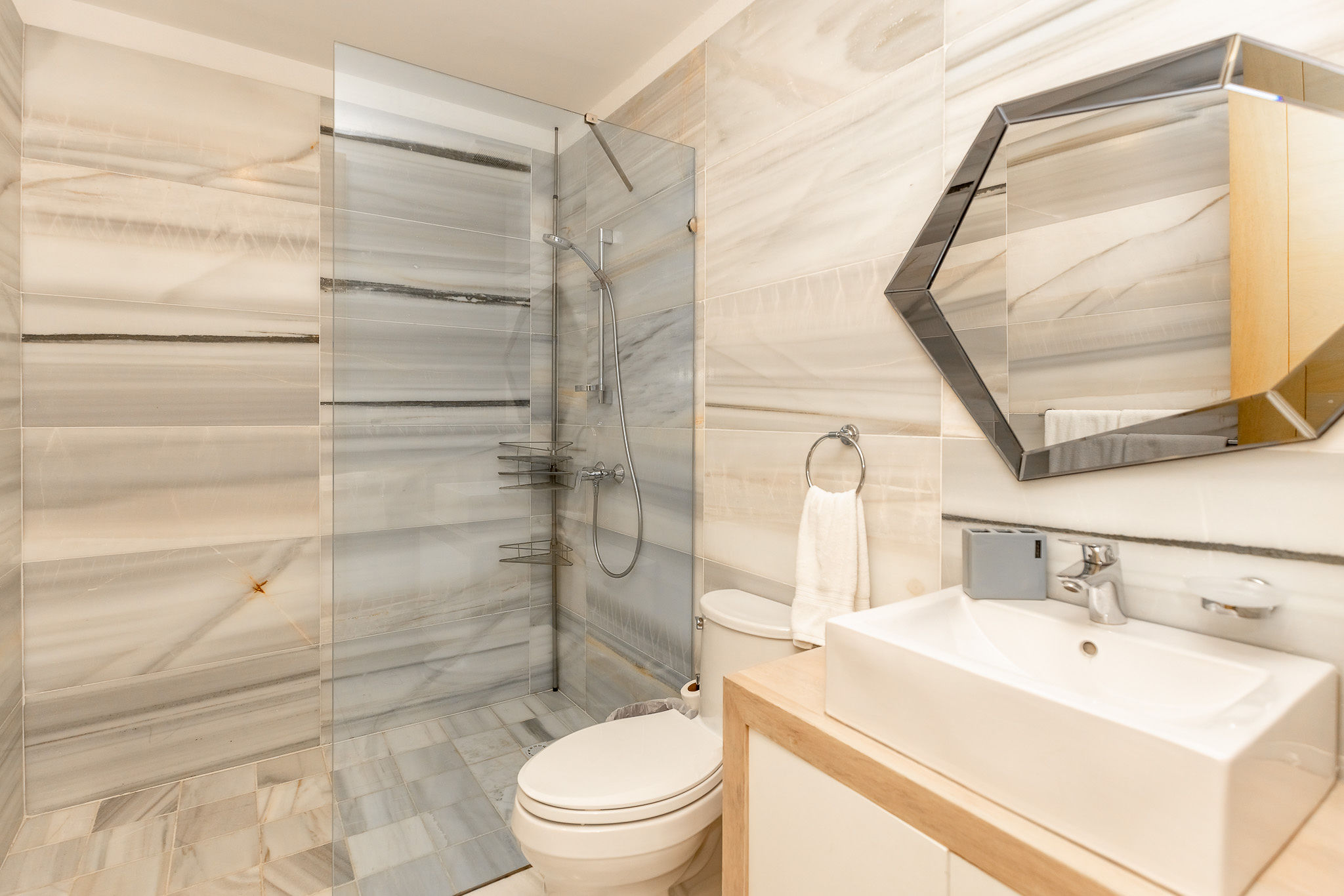 • Floors and bathrooms in Imported White Macael Marble